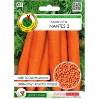 Marchew Nantes 3 to odmiana średnio wczesna która wyróżnia się nieco krótszym okresem wegetacji oraz większym plonowaniem. Wysiew nasion bezpośrednio do gruntu najlepiej wykonać na początku kwietnia a w maju najlepiej wykonać przerywkę pozostawiając sadzonki w odstępach 4x30 cm. Aby plony były obfite marchew należy wysiać na glebie żyznej, umiarkowanie wilgotnej oraz o odczynie gleby obojętnym na stanowisku nasłonecznionym. Przeznaczona na zbiór letni lub jesienny. Odmiana ta zawiera dużo beta - karotenu który wpływa korzystnie na nasz wzrok oraz minerały takie jak potas, fosfor, żelazo, magnez i wapń. Idealnie nadaje się na soki, surówki czy przetwory jednak w małym stopniu nadaje się na przechowywanie. Marchew najlepiej rośnie w temperaturach od 15 do 21 stopni Celsjusza. Nasiona marchwi Nantes 3 zostały pokryte otoczkami co zapewnia optymalne warunki kiełkowania oraz ochronę przed chorobami