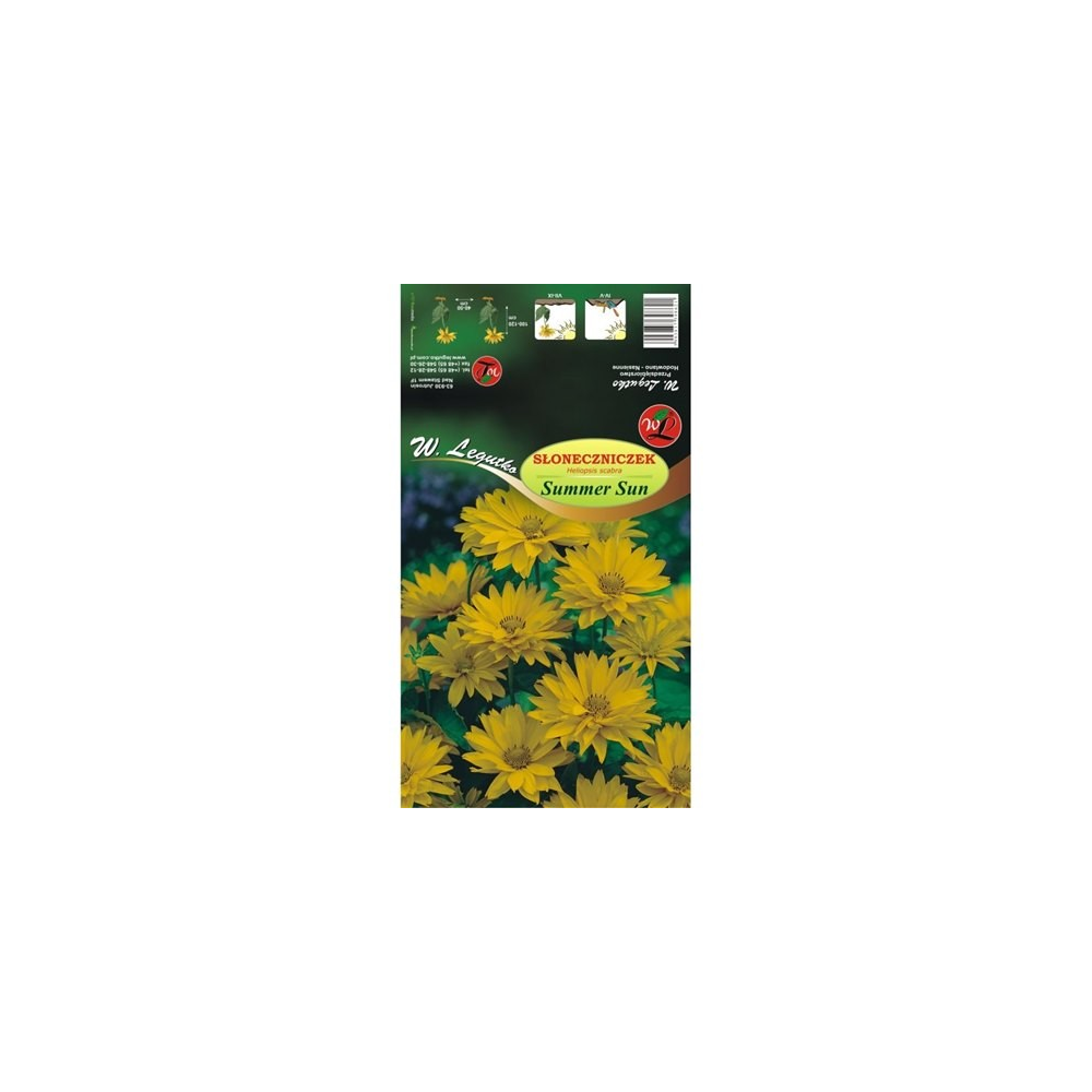 Słoneczniczek Summer Sun to roślina wieloletnia która z pewnością rozświetli i ożywi przestrzeń wokół domu. Wysiew od kwietnia do czerwca pod osłony, zaś sadzenie przypada na wrzesień. Najlepszym stanowiskiem pod uprawę jest słoneczne, ciepłe i częściowo osłonięte od wiatru miejsce z przepuszczalną, umiarkowanie wilgotną i żyzną glebą. Kwitnienie rozpoczyna się w drugim roku od siewu i trwa od lipca do końca września. Liczne kwiaty złożone są w koszyczki które są osadzone na roślinie pojedynczo, jak również zebrane w wiechy. Liście mają szorstkie włoski, są ciemnozielone i wyrastają na łodydze naprzeciwlegle. Gatunek proponowany w naszym sklepie idealnie nadaję się na rabaty kwietne. Doskonale prezentuje się w grupie, wymieszany z innymi gatunkami o podobnym wzroście.