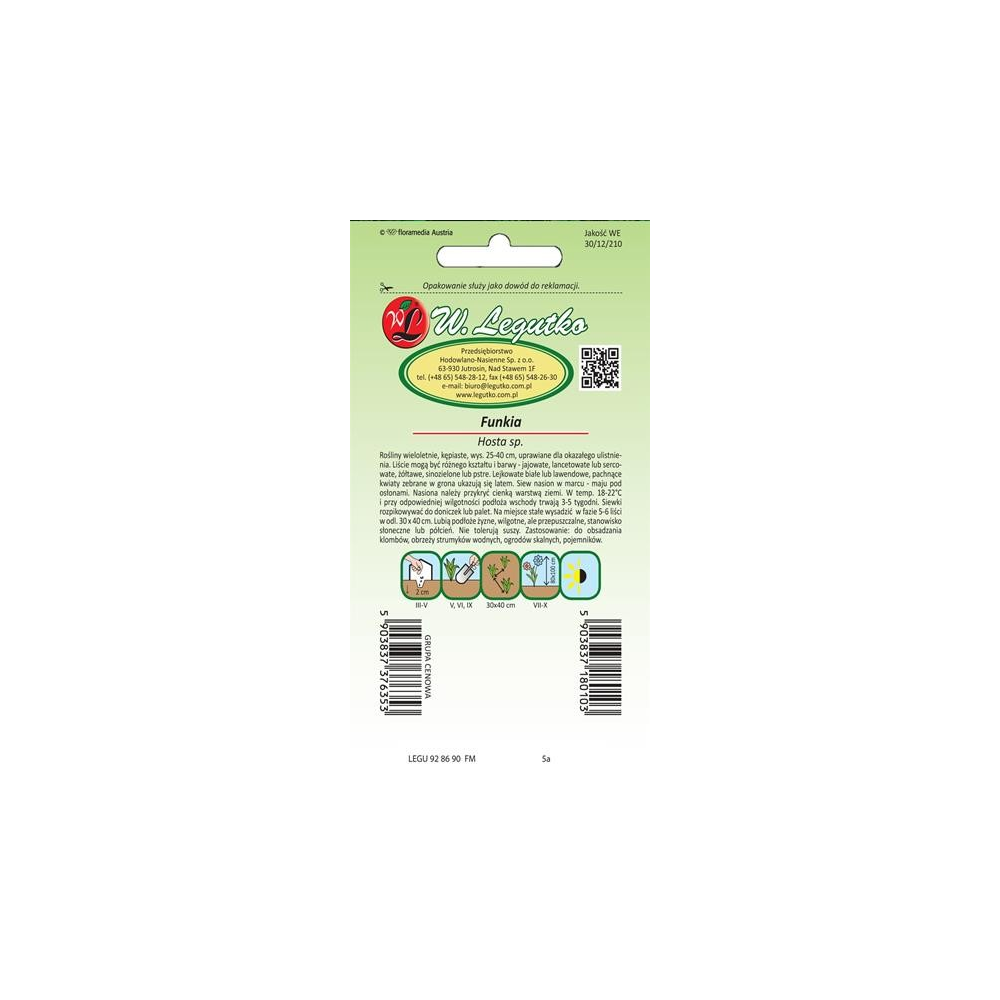 Nasiona wysiewamy od marca do maja pod osłonami, a na miejsce stałe wysadzamy w fazie 5-6 liści w rzędy co 30-35 cm. Do uprawy należy wybrać glebę żyzną, wilgotną, przepuszczalną a miejsce słoneczne lub półcieniste. Funkia kwitnie przez całe lato.