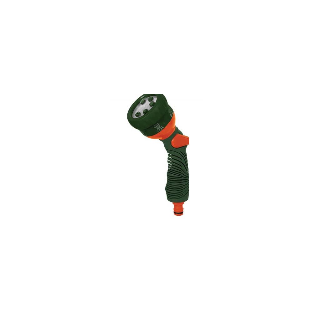 Pistolet do zraszania SuperMulti. Model SuperMulti z perlatorem wyposażony w sześciostopniową regulację strumienia wody (mist, vertical, flat, shower, jet, cone) oraz blokadę. Elastyczna i miękka powłoka pistoletu zapobiega ślizganiu się dłoni. Ergonomiczny uchwyt zapewnia wygodę użytkowania.
