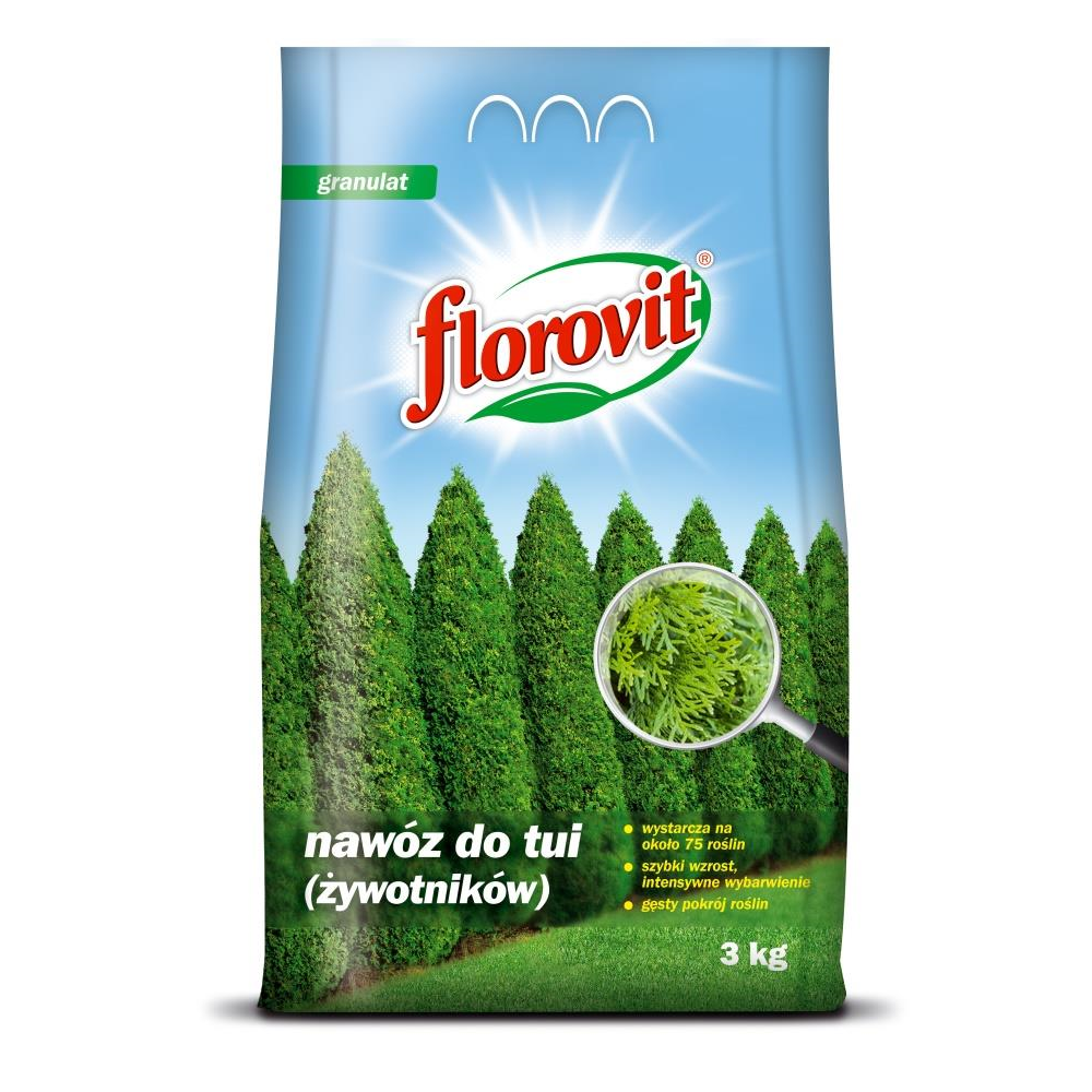 Florovit nawóz do tui (żywotników) zawiera składniki pokarmowe w odpowiednich formach i ilościach, dostosowanych do wymagań pokarmowych tui. Nawóz ten jest idealny dla tui w nasadzeniach pojedynczych, jak i w nasadzeniach grupowych (żywopłotów).