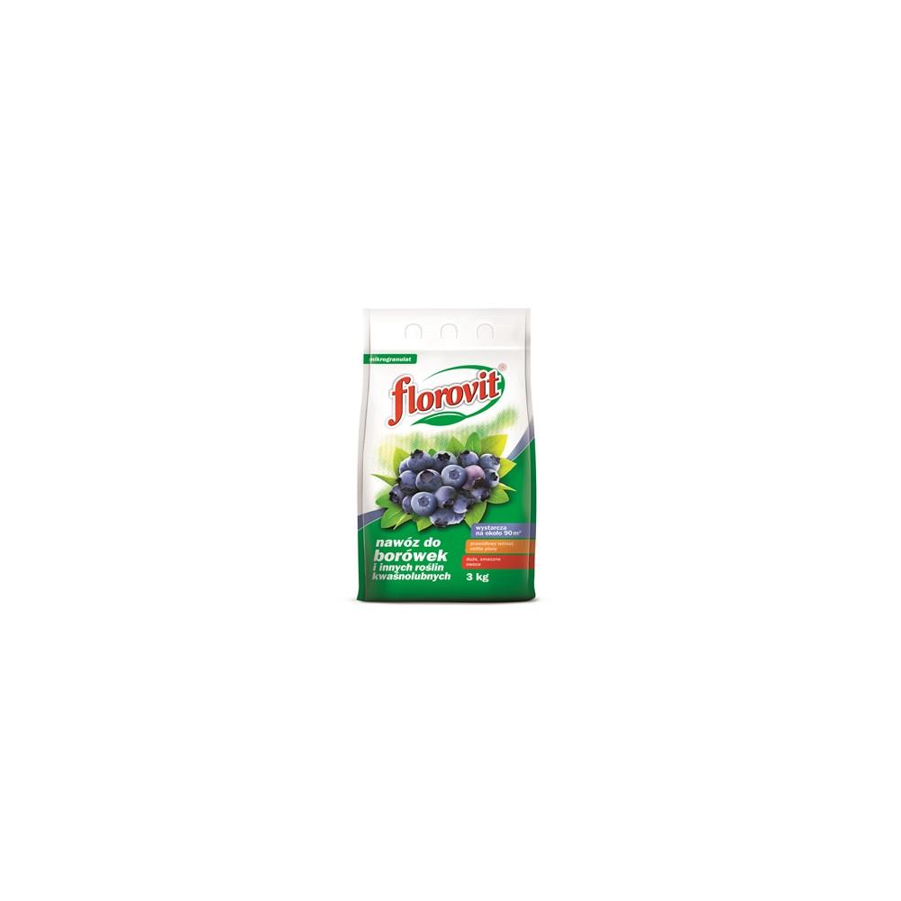 Wieloskładnikowy, mineralny nawóz doglebowy, przeznaczony do pogłównego dokarmiania borówek w pierwszym roku po posadzeniu i w dalszych latach uprawy. Ważną zaletą Florovitu do borówek jest zdolność zakwaszania gleby, co wyraźnie sprzyja wzrostowi i rozwojowi roślin wymagających stanowiska o niskim odczynie podłoża. Cechuje go również brak azotanów. Borówki sadzi się jesienią w podłoże o pH 3,8 - 4,8. Rośliny uprawiane w podłożu o zbyt wysokim odczynie charakteryzują się małymi przyrostami oraz przedwczesnym żółknięciem i opadaniem liści. Nawóz zapobiega chlorozie liści w okresie wegetacji roślin. Ponadto zastosowano w nim słabo przemieszczające się w glebie formy składników pokarmowych, co zabezpiecza je przed wymywaniem do wód gruntowych.