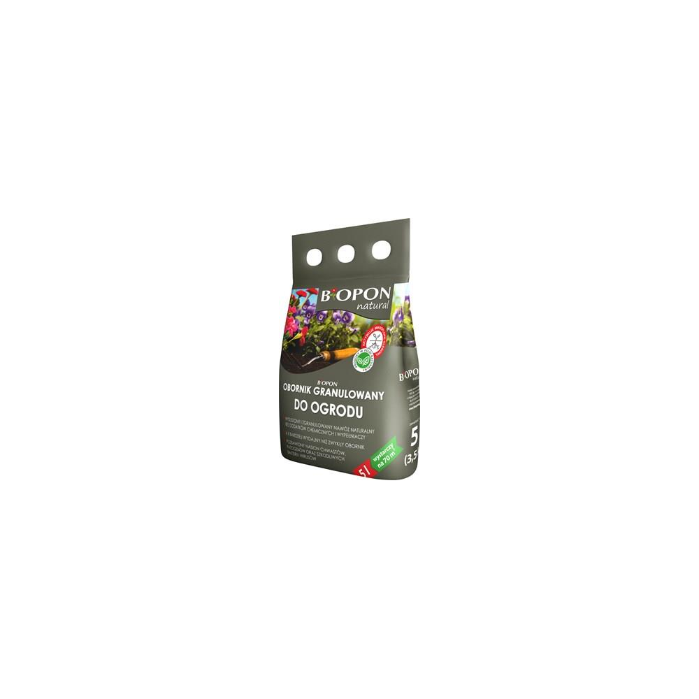BIOPON obornik granulowany to silnie skoncentrowany nawóz naturalny, powstały z odchodów drobiu. Obornik został poddany procesowi fermentacji i suszenia, które niszczą drobnoustroje oraz nasiona chwastów mogące znajdować się w nawozach naturalnych, jednocześnie zachowując wszystkie składniki korzystne dla wzrostu i rozwoju roślin. BIOPON obornik granulowany doskonale użyźnia i spulchnia glebę, zwiększa jej zdolność do magazynowania wody oraz aktywizuje mikroflorę glebową. BIOPON obornik granulowany może być stosowany przez cały rok do nawożenia wszystkich roślin ogrodowych: warzyw, drzew i krzewów owocowych, roślin ozdobnych, a także do roślin doniczkowych oraz roślin uprawianych na balkonach i w tunelach foliowych.
